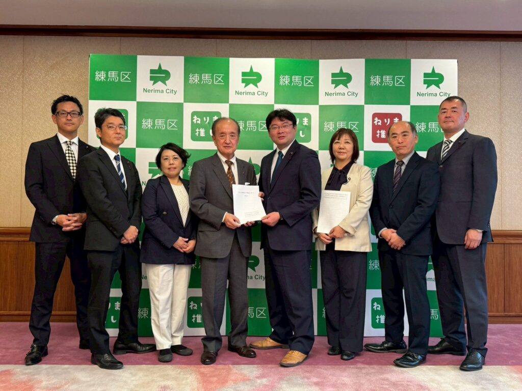 前川区長に要望書を手渡す区議団。(右から)有馬豊区議、坂尻まさゆき前区議、とや英津子都議、 やくし辰哉区議、小松あゆみ区議、島田拓区議、のむら説区議(2025年11月20日、練馬区役所)